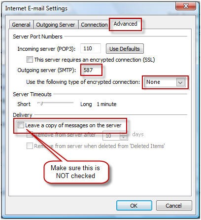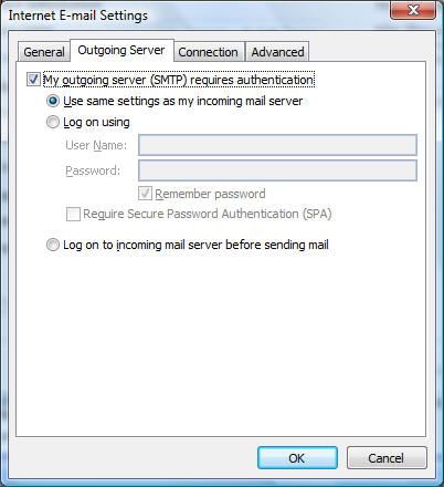 Outgoing (SMTP) Server: mail.yourdomain.comDo NOT use SPA, SSL, or any sort of encryption: