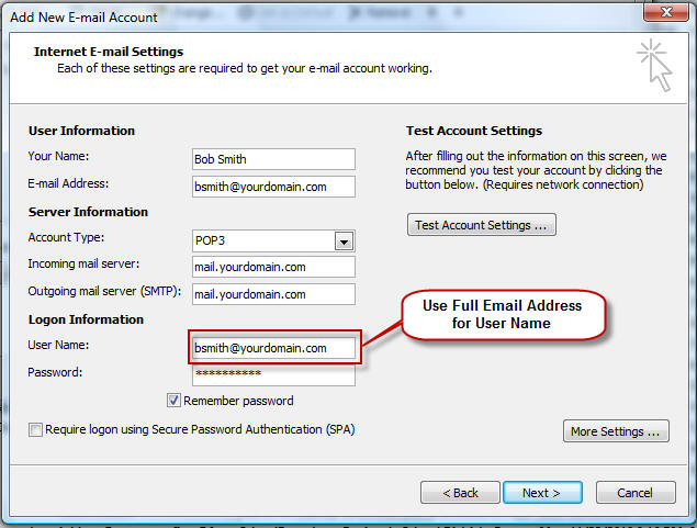 Incoming (POP3) Server: mail.yourdomain.com